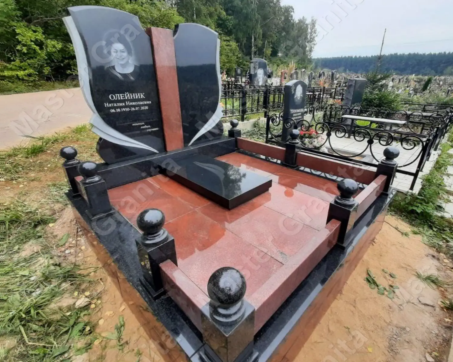 Лаконичный мемориальный комплекс выполнен из двух материалов: диабаза и сюскюянсаари. Это великолепное сочетание темного и красного создает неповторимый образ, который подходит, чтобы увековечить память о близком человеке.