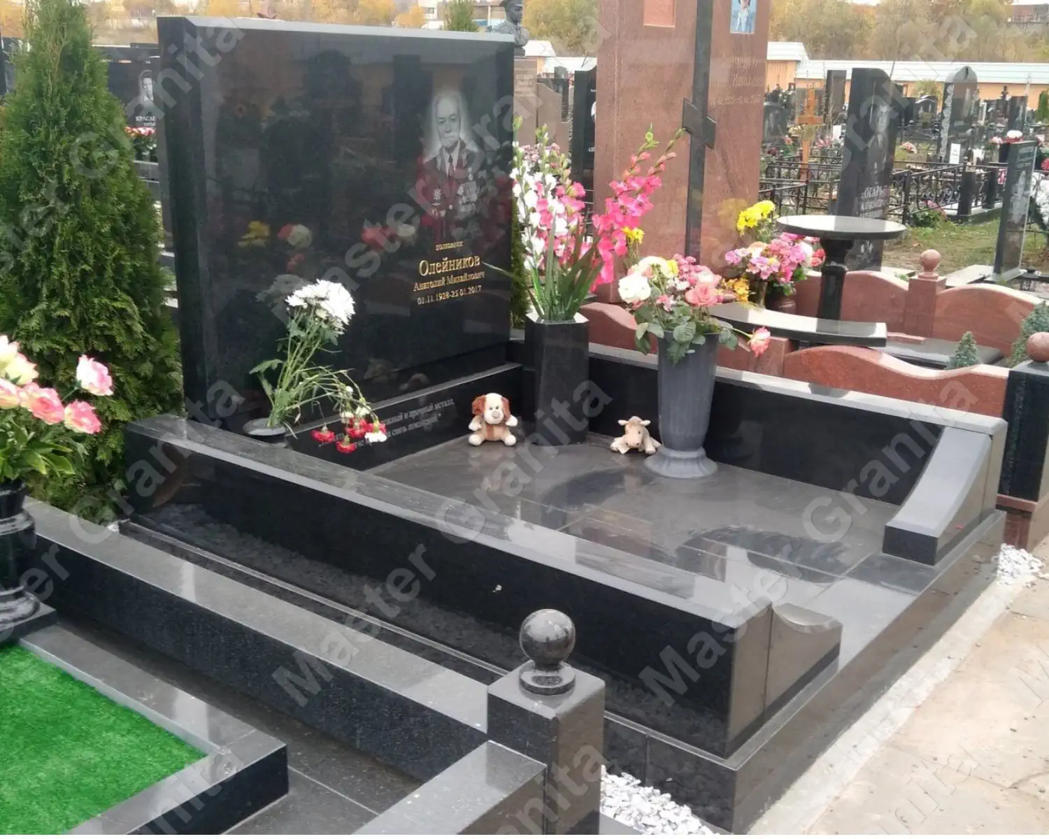 Комплекс выполнен из диабаза для мужчины. Акцент сделан на гранитном элементе закрепленным на стеле, в котором расположена большой фотокерамика в черно-белом стиле. К достоинством фотокерамики в данной работе можно отнести ее большой срок службы, отсутствие выцветания при УФ воздействии солнца, а так же возможность нанесения высоко детализированного изображения.