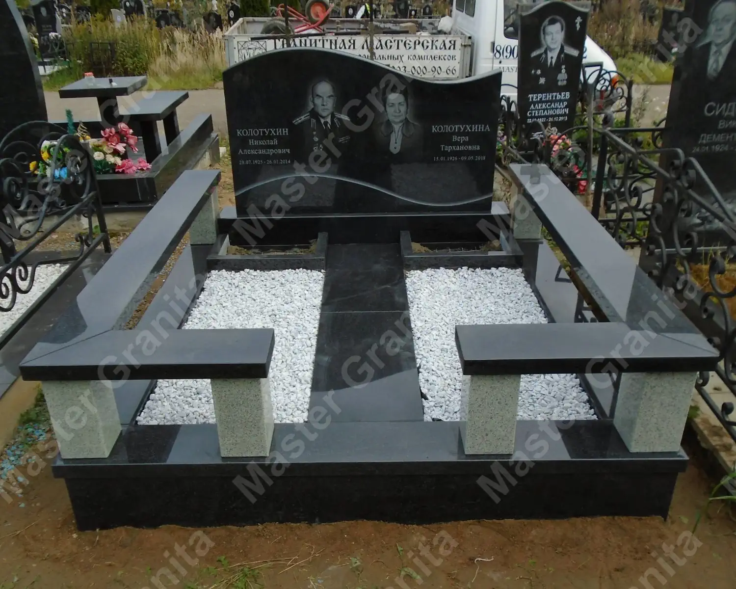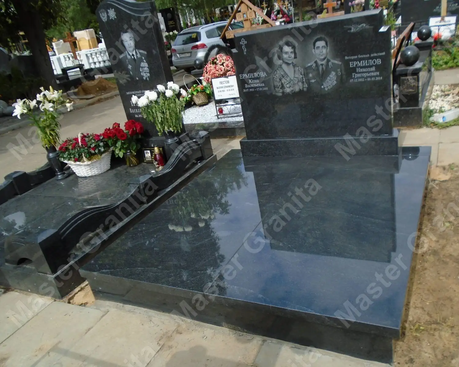 Мемориальный комплекс открытого типа, без гранитного цоколя. Выполнена облицовка ленточного фундамента цельными деталями из диабаза, и закрыто двумя массивными плитами из гранита, в качестве пола. Целью работы было показать совместный портрет-дуэт, и сделать все из камня, не нагромождая участок.