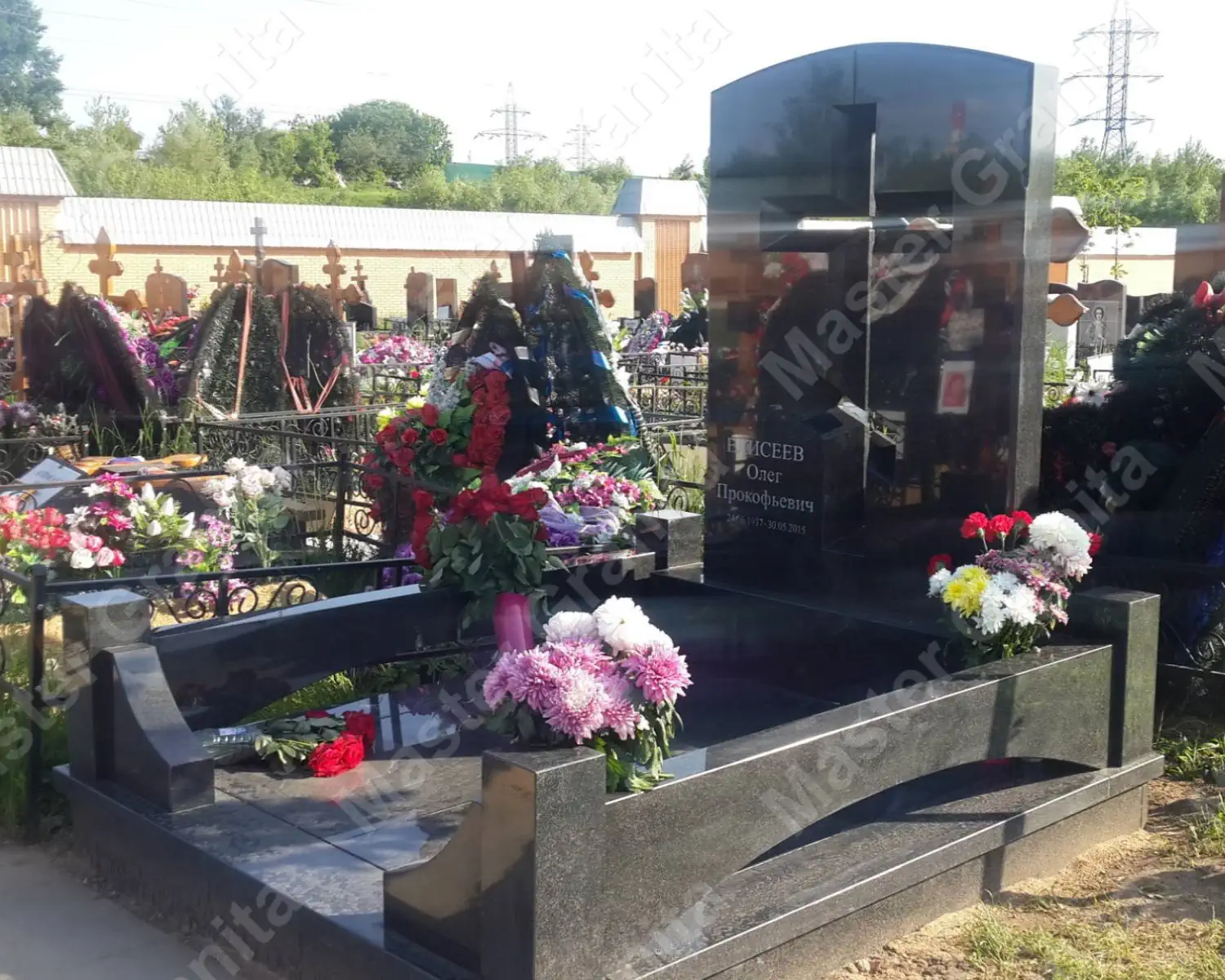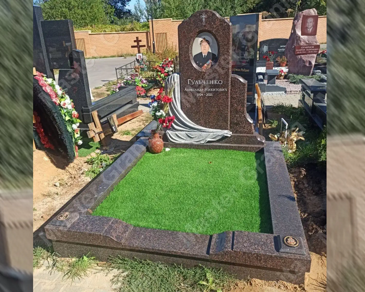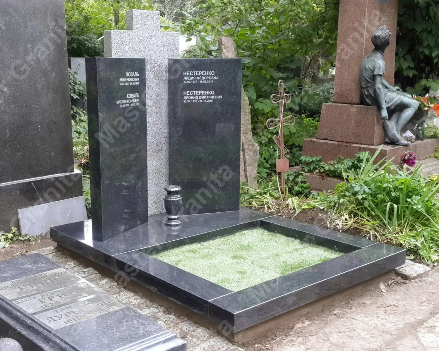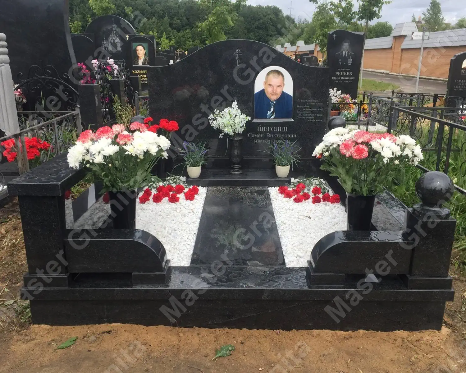 Комплекс из дымовского гранита создан, исходя из пожеланий клиента. Основные отличия: низкие резные цоколя из гранита, Закругленная стела с овальной керамикой и фацетом вокруг, а так же плащеница. Все элементы отрисовывались в 3D для согласования формы и размеров.