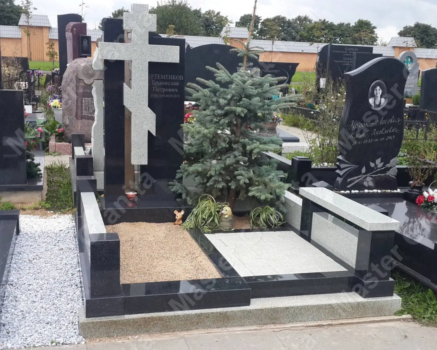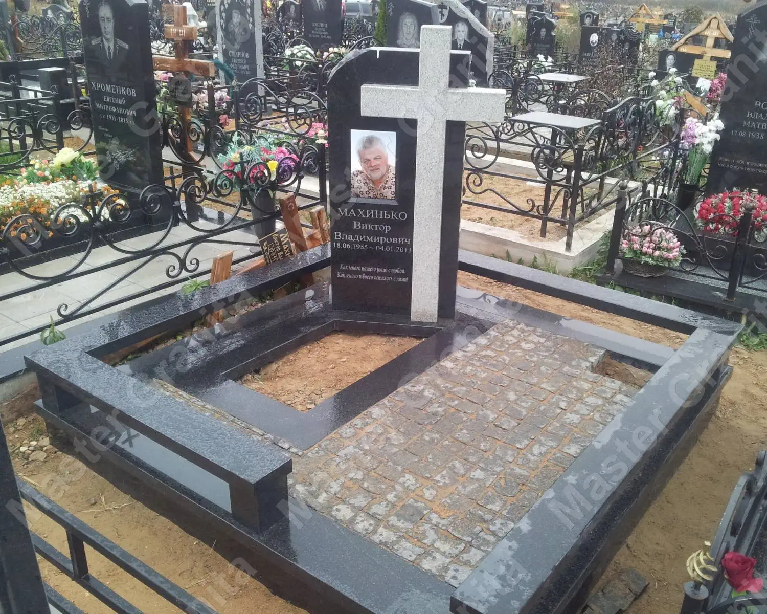 Мемориальный комплекс авторского дизайна. Были учтены все пожелания клиента, и проработаны до мельчайших деталей: вертикальная стела с надписями, большой гранитный крест из мансура, высокие светлые цоколя, которые прекрасно смотрятся с темными столбами, большой цветник на участке, а так же элегантно встроенной в цоколь каменной скамьей.