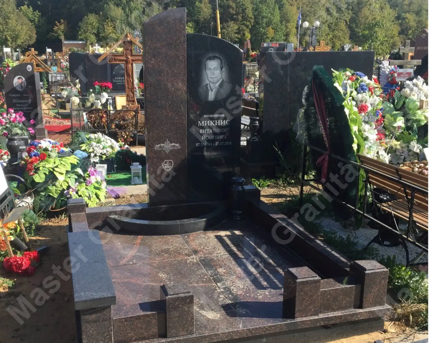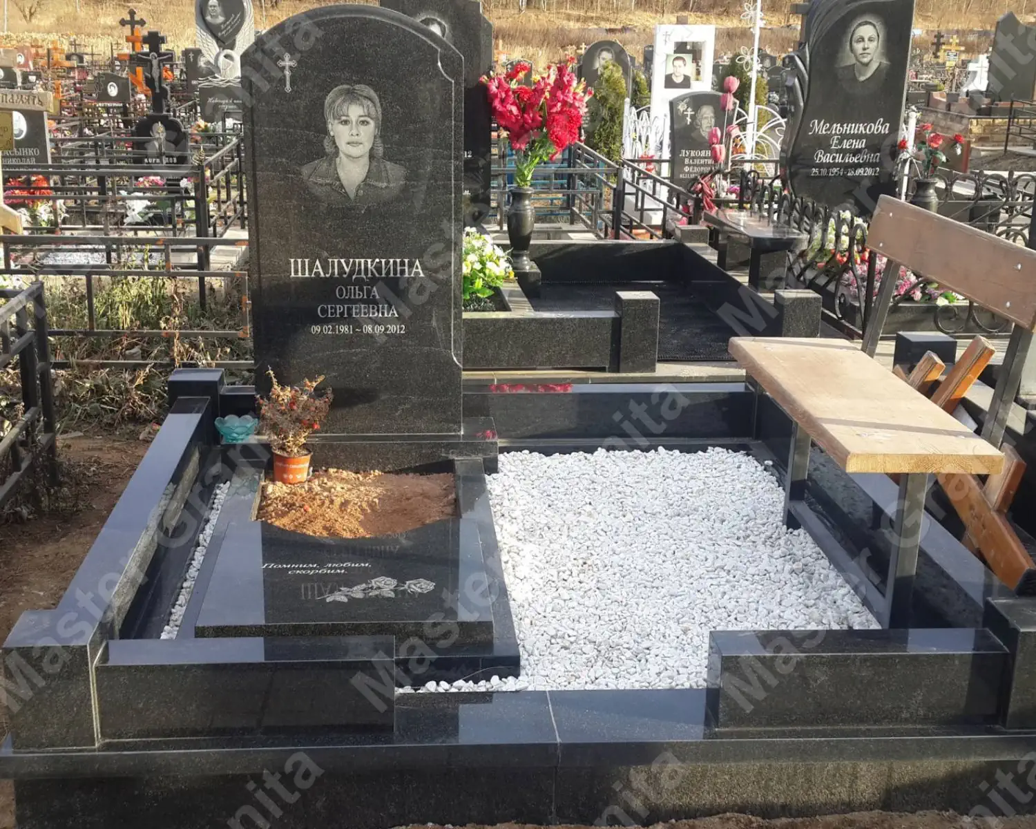 Классический мемориальный комплекс из Карельского диабаза с прямыми линиями цоколя, а так же резной стелой с четвертью, подчеркиющей ее форму. На цветнике используется накладка с гравировкой эпитафии, а так же возможность использовать ее как подставку под цветы, лампадку.