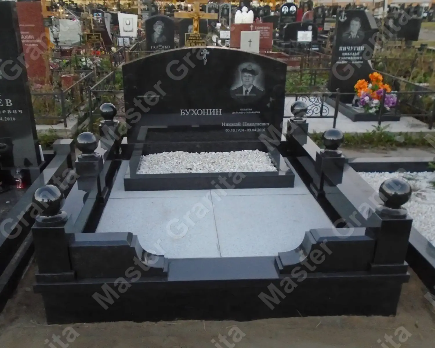 Классический мемориальный комплекс из темного гранита, как дань вечной памяти. Строгий стиль разбавлен круглыми шарами из диабаза, а входная цокольная группа с резкой, четвертью и фацетом. Цветник засыпан мраморной крошкой с геотекстилем, которую в будущем можно заменить на грунт, и посадить цветы.