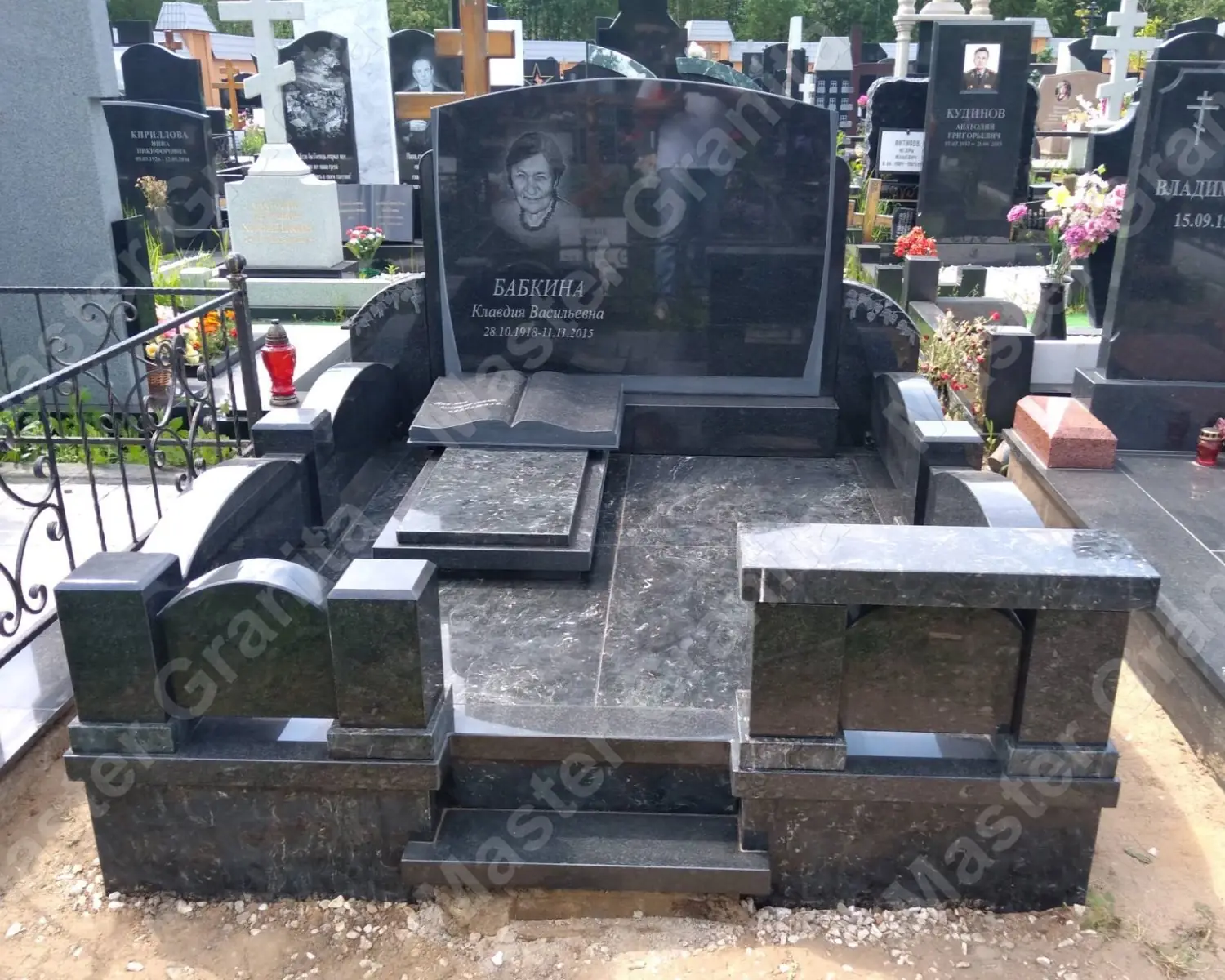 Особое внимание привлекает большая горизонтальная стела, которая символизирует прочность и надежность. Рядом с памятником находится надгробная плита, на которой располагается резная книга из гранита. Все это дополняют воздушные цоколя из гранита с закругленной формой, гранитные полы, а так же широкая ступень.