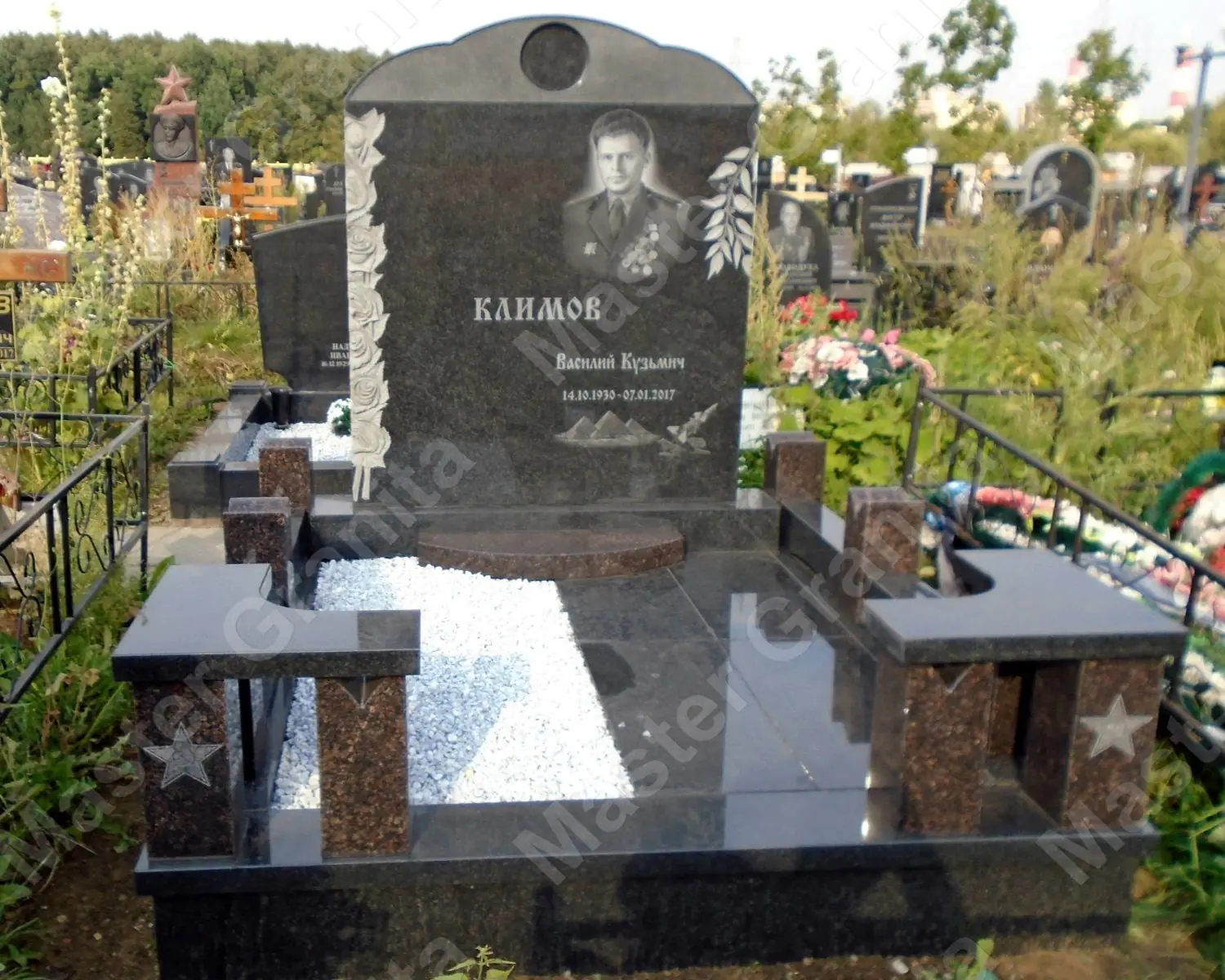 Два материала не просто отлично смотрятся вместе, но и дополняют друг друга в этом прекрасном мемориальном комплексе, выполненном из Карельского диабаза и дымовского гранита. Стиль комплекса выполнен из резных столбов, напоминающие стены Кремля, так как усопший принимал участие в военных парадах. А граверные работы, словно напоминание, о ключевых событиях на жизненном пути.