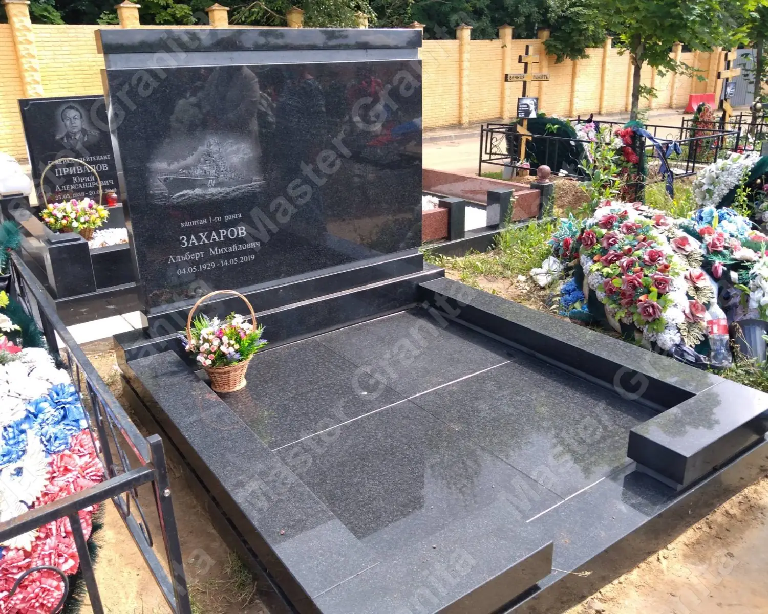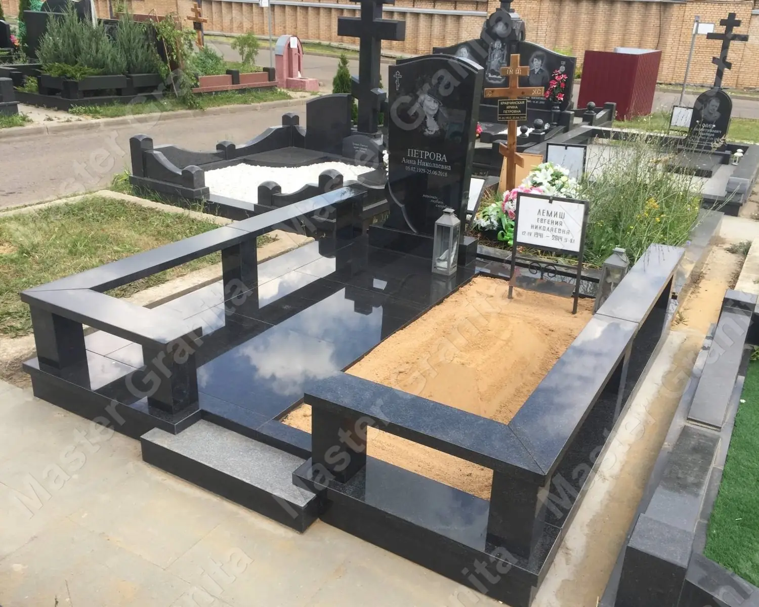 Производились реставрационные работы на участке с добавлением цельных гранитных деталей, резных стел, а так же врезка фотокерамики. Стоит отметить, что участок расположен на небольшой высоте от земли, а цоколя имеют воздушность, которая позволит воде уходить, так как они лежат на подложках столбов. Все детали надежно склеены, а швы обработаны герметиком на резиновой основе.