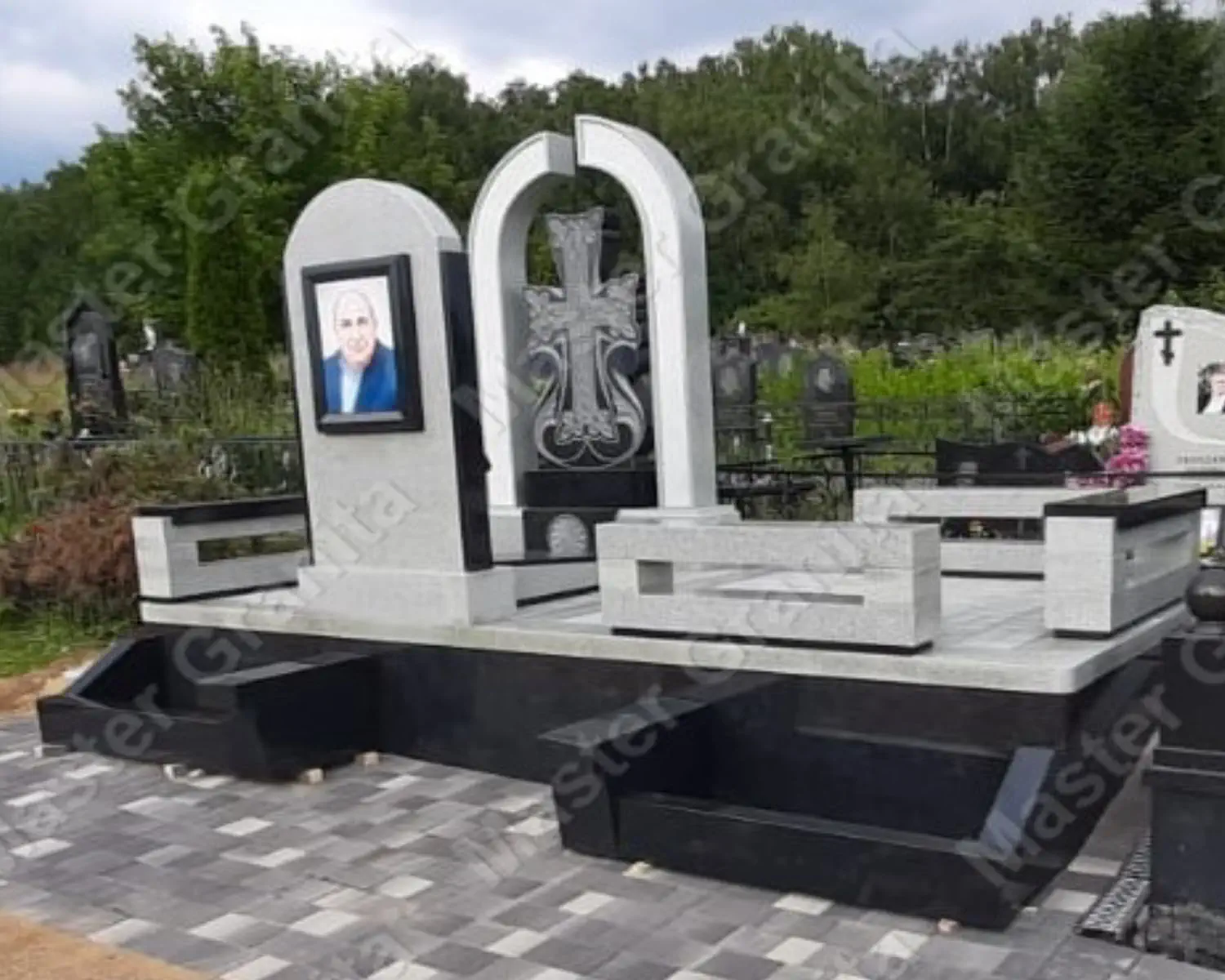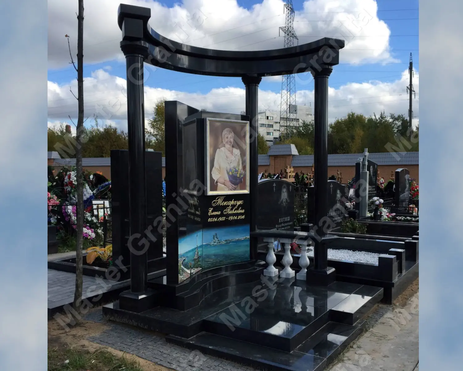 Комплекс из карельского диабаза выполнен в форме ротонды. Балясины из белого мрамора освежают общий вид композиции. Фотография, напечатанная на керамике, вклеена в рамку из мрамора. Такой прием используется для имитации картины.
