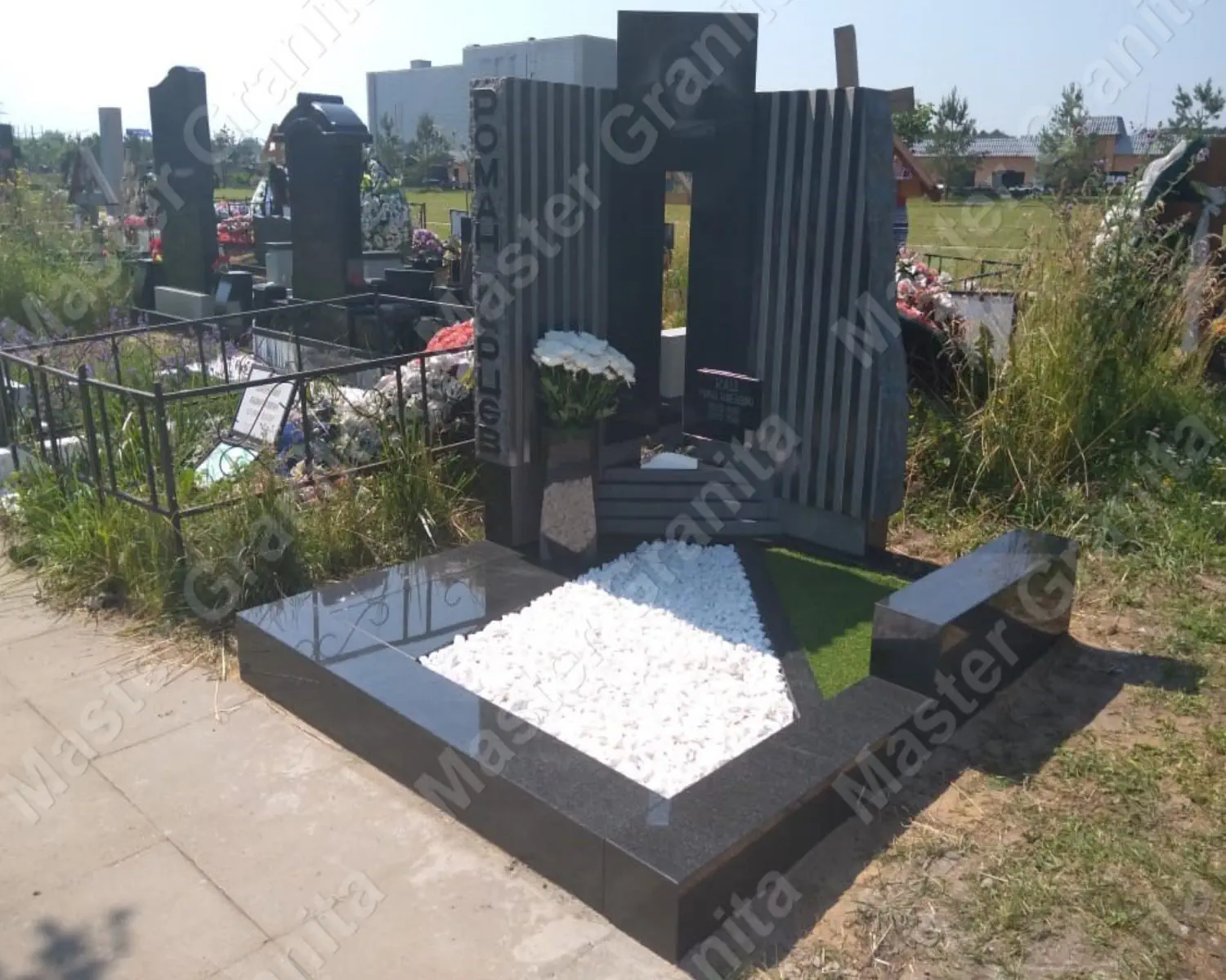 Практически двухметровая каменная глыба из мансуровского гранита величественно возвышается из низкого участка, который максимально приближен к земле по просьбе клиента.