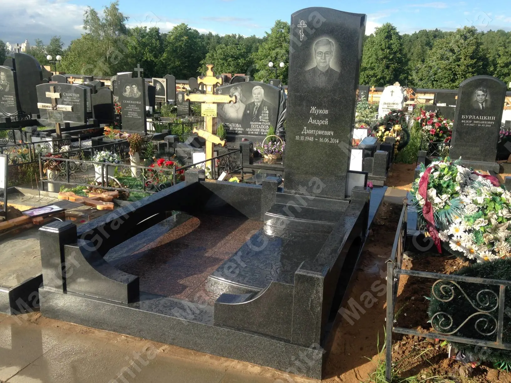 Монолитное семейное захоронение выполнено из гранита жельтау, который называют солнечным камнем. Надпись на камне выложена итальянской бронзой. Стела выточена в необычной форме - в форме полусферы, что разительно отличает этот комплекс от других. Участок имеет пол с термообработкой.